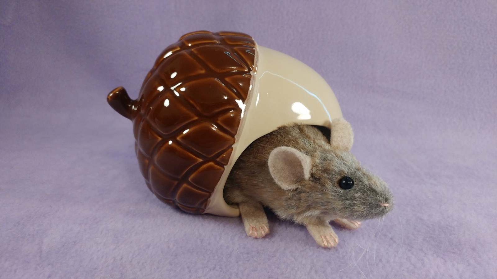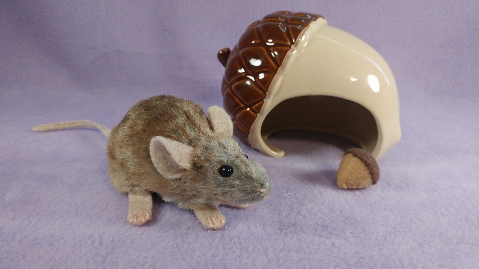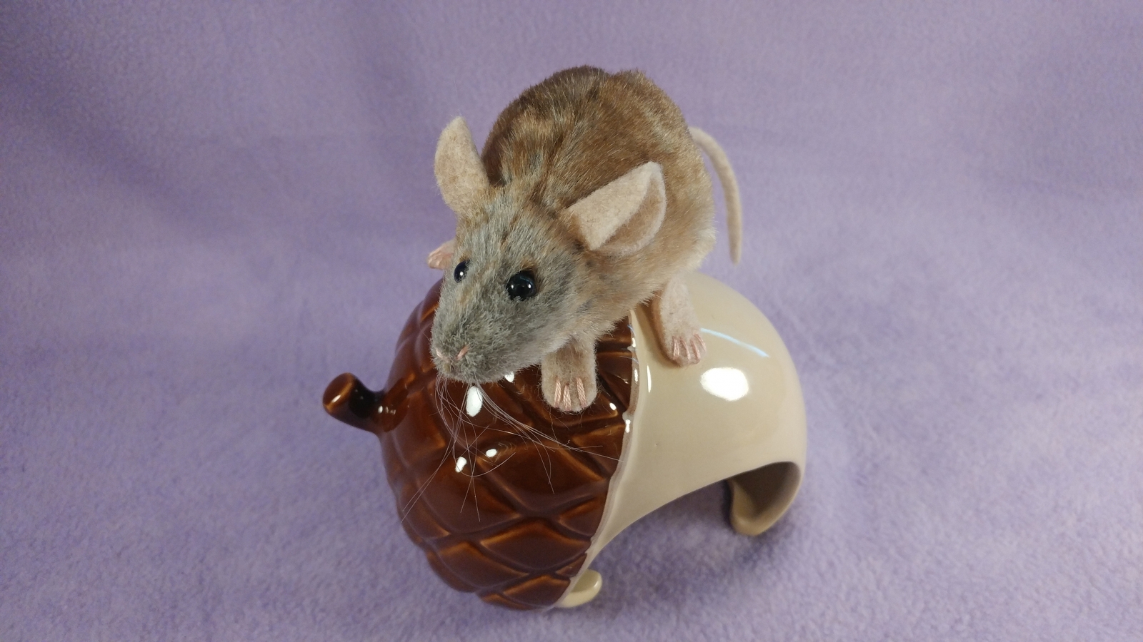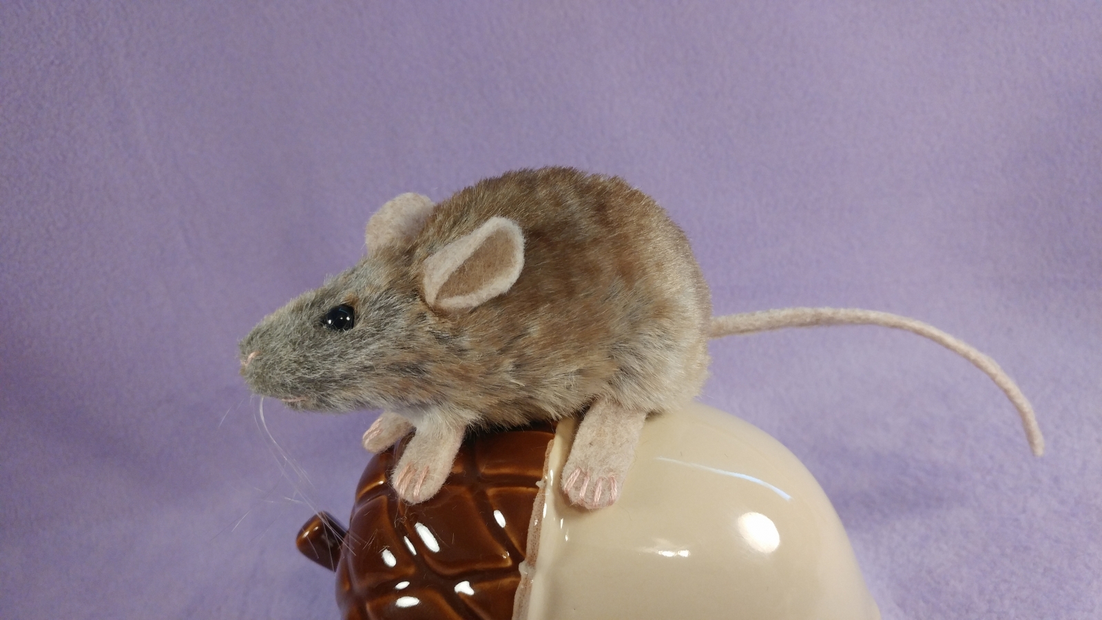 A mouse plushie with light brownish greyish fur.