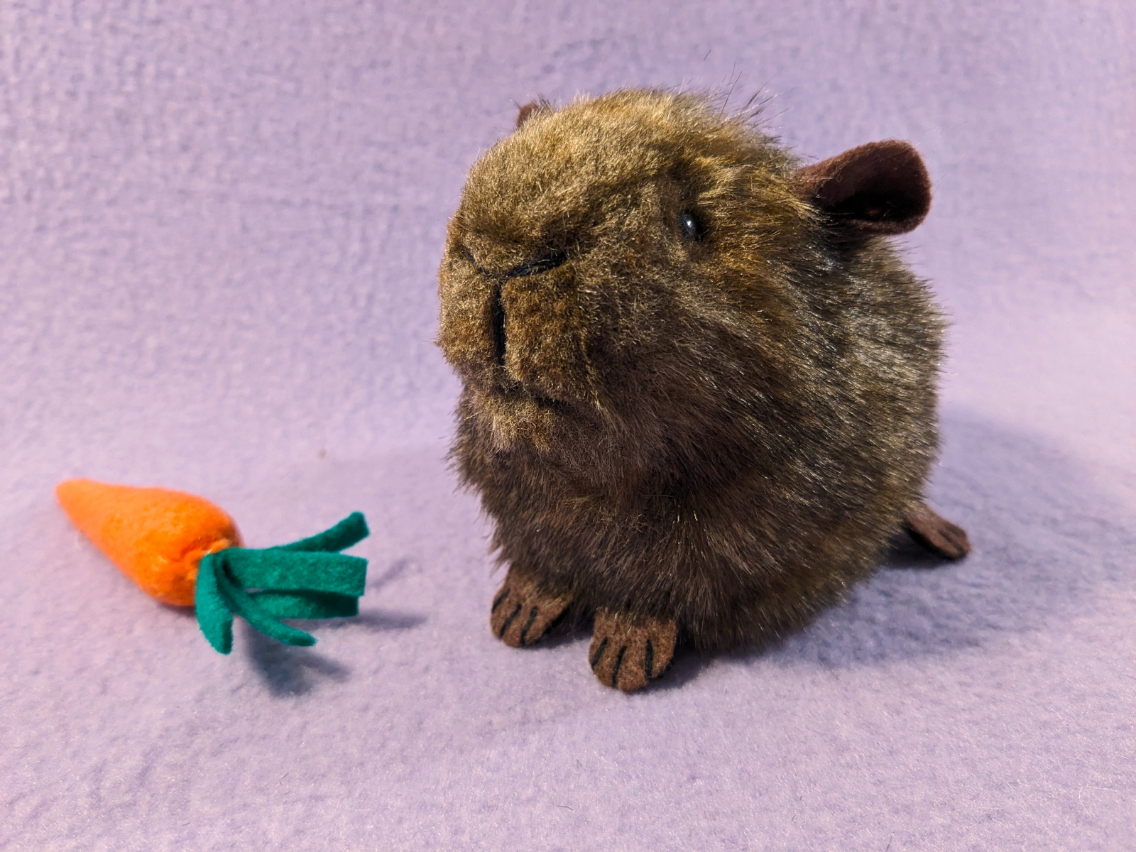 This cute little guinea pig plushie is created from an original pattern. Each plushie is made with soft faux fur and measures about 5.5 inches from nose to fuzzy butt. They feature details just like a real guinea pig, with 4 toes on the front feet and 3 toes on the hind feet, and the little ears can either stand up or fold down.