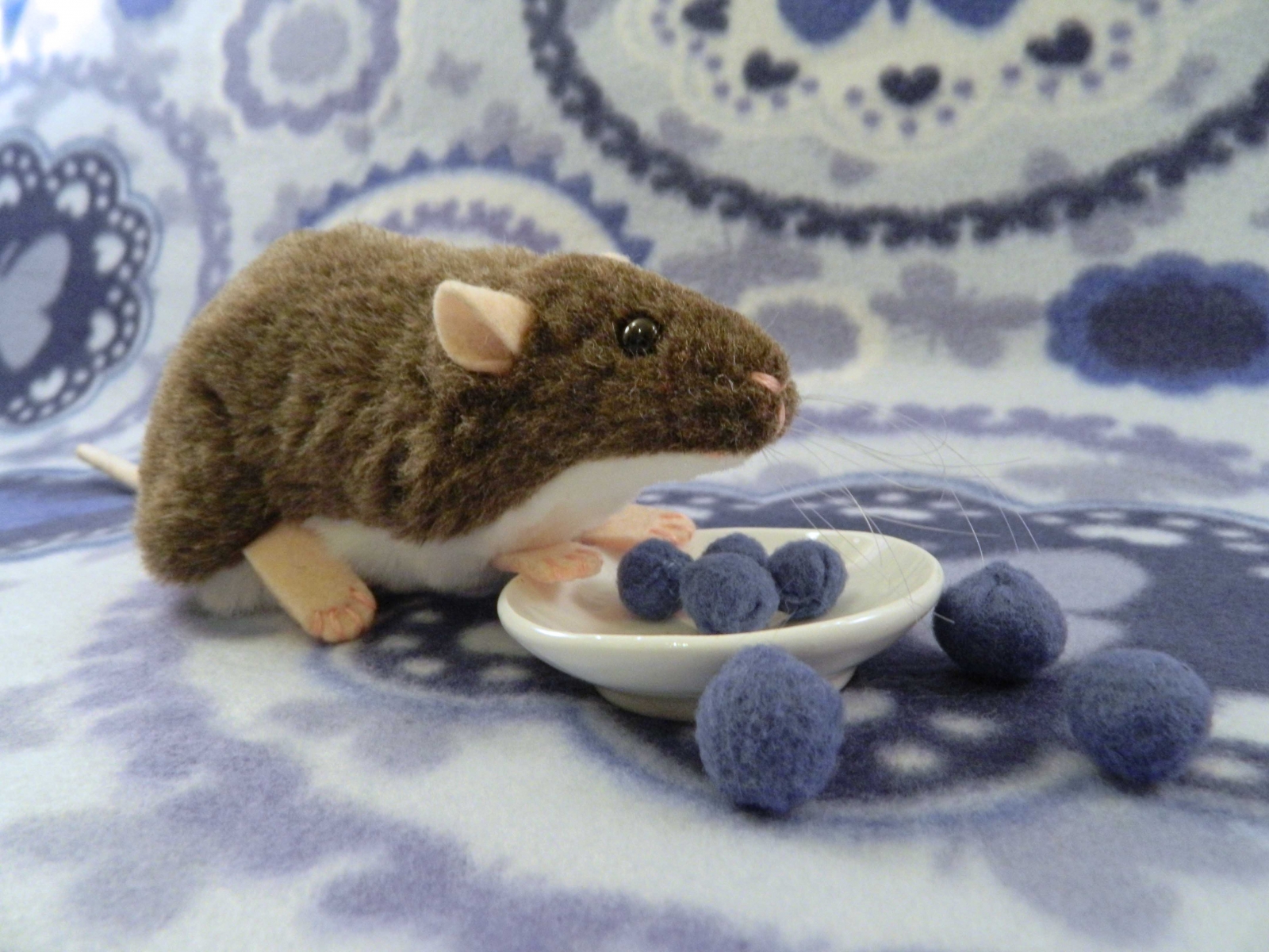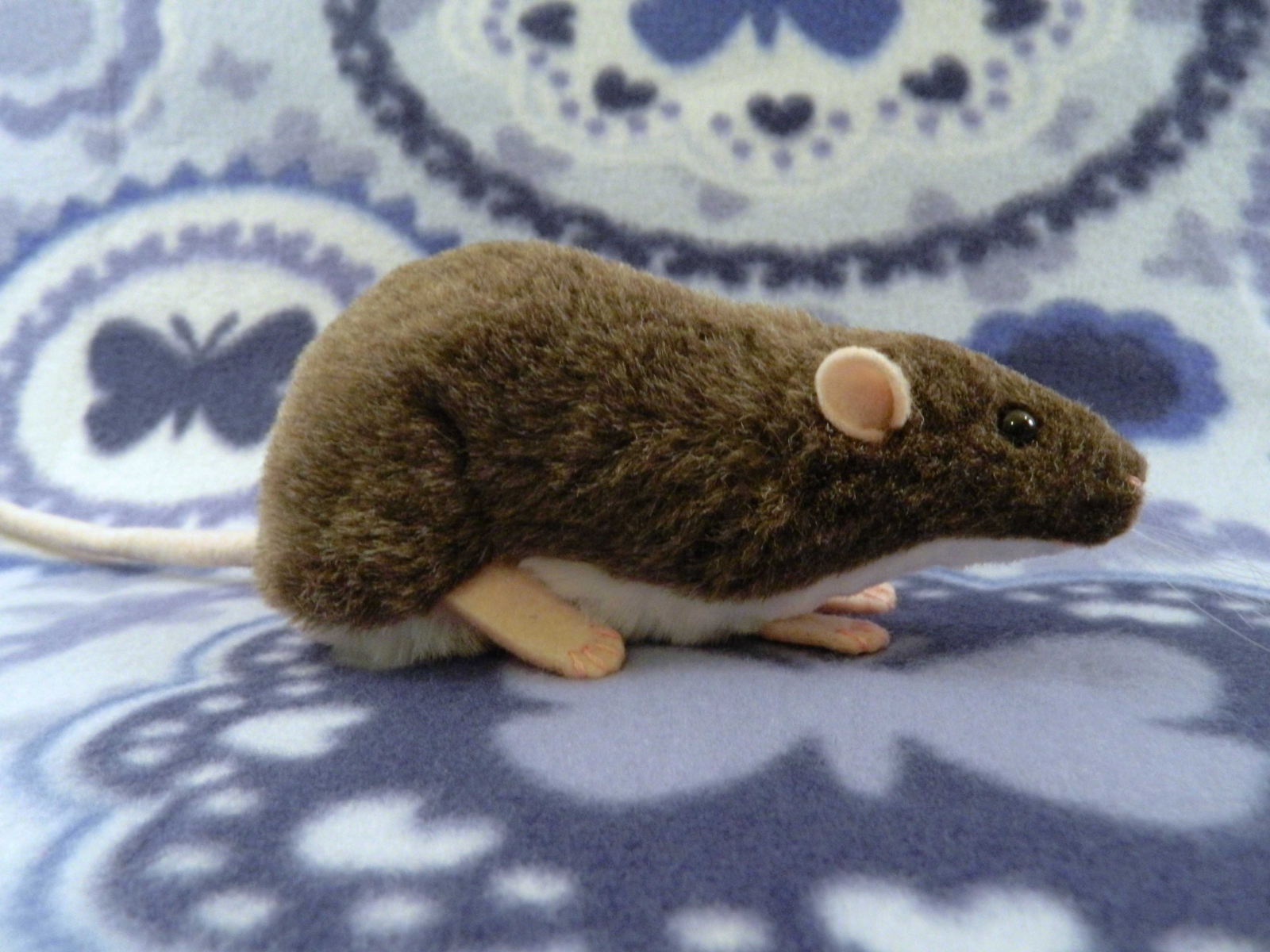 This cute, fuzzy rat plushie is created from an original pattern . Each plush is made with soft faux fur, and measures about 7 inches from nose to fuzzy butt. They feature details just like a real rat, with 4 toes on the front feet and 5 toes on the hind feet. The tail is approximately 7 inches long.