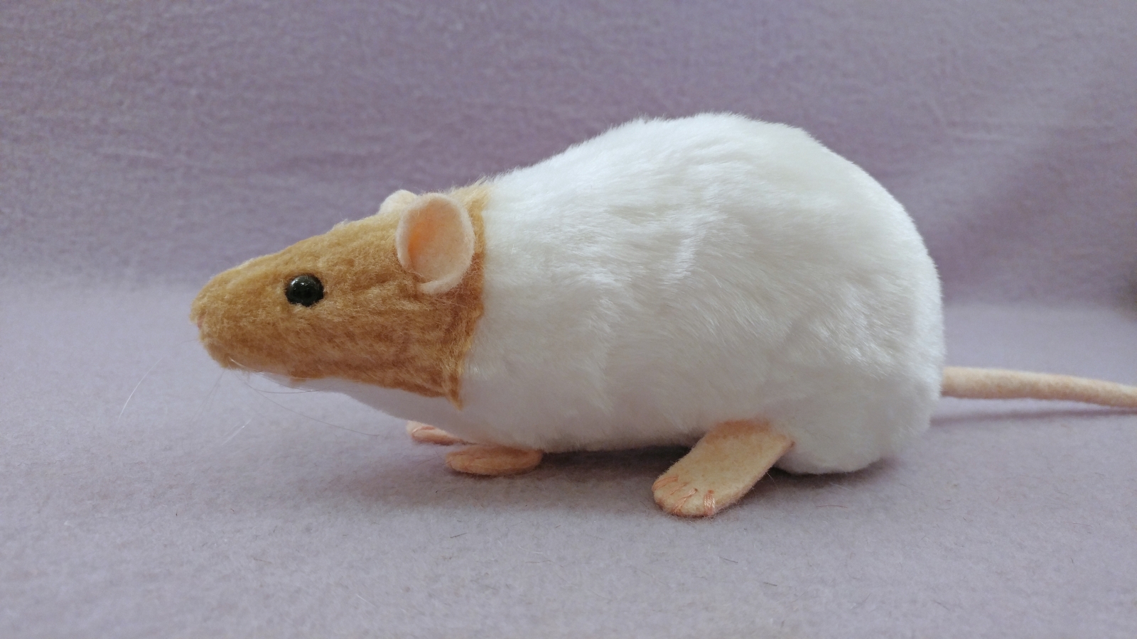 A capped rat plushie with beige coloring on the top of the head. The rest of the body is white.