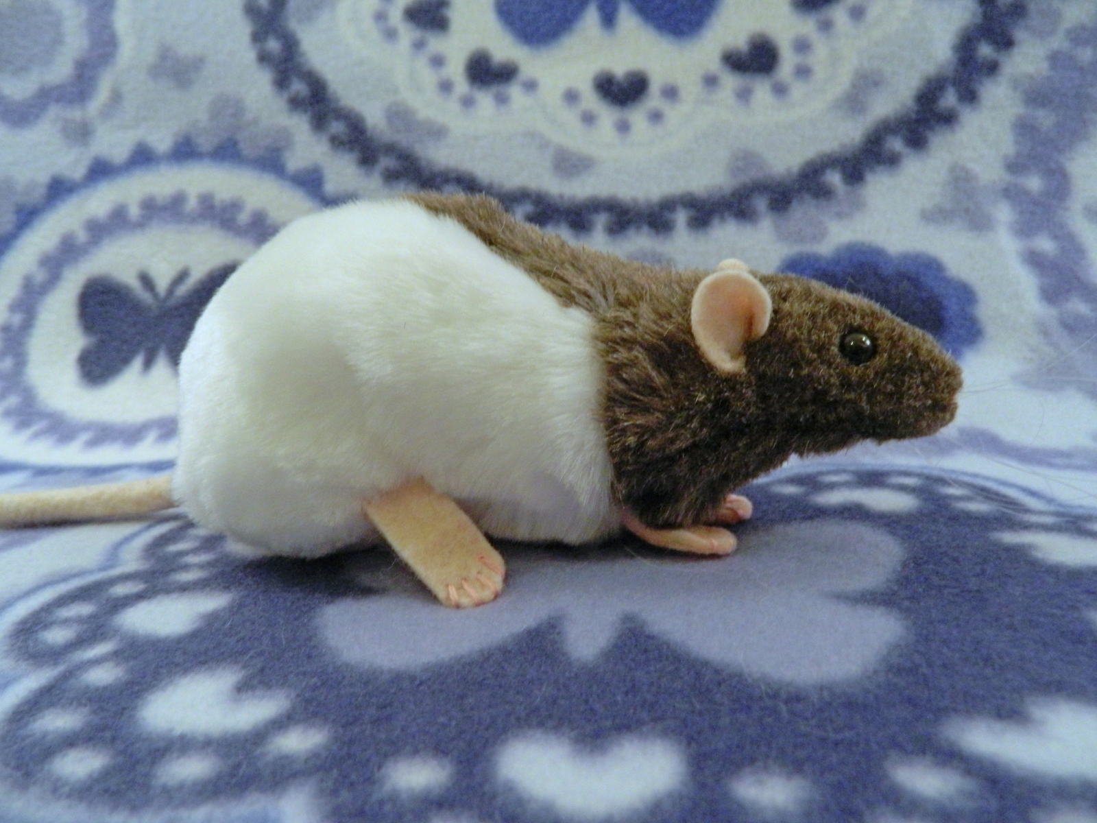 A hooded rat plushie with a mink colored head and stripe going halfway down its back. The rest of the body is white.